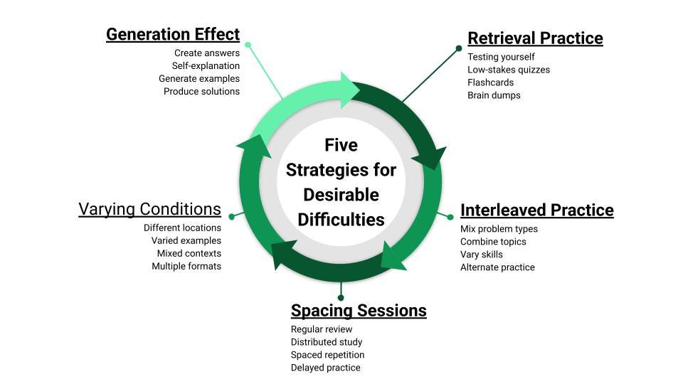 Desirable difficulties are learning conditions that make performance initially harder but create stronger, more durable learning. The key word is "desirable." Not all difficulties help learning. The challenge must trigger the right cognitive processes, and students must have enough background knowledge to succeed eventually.